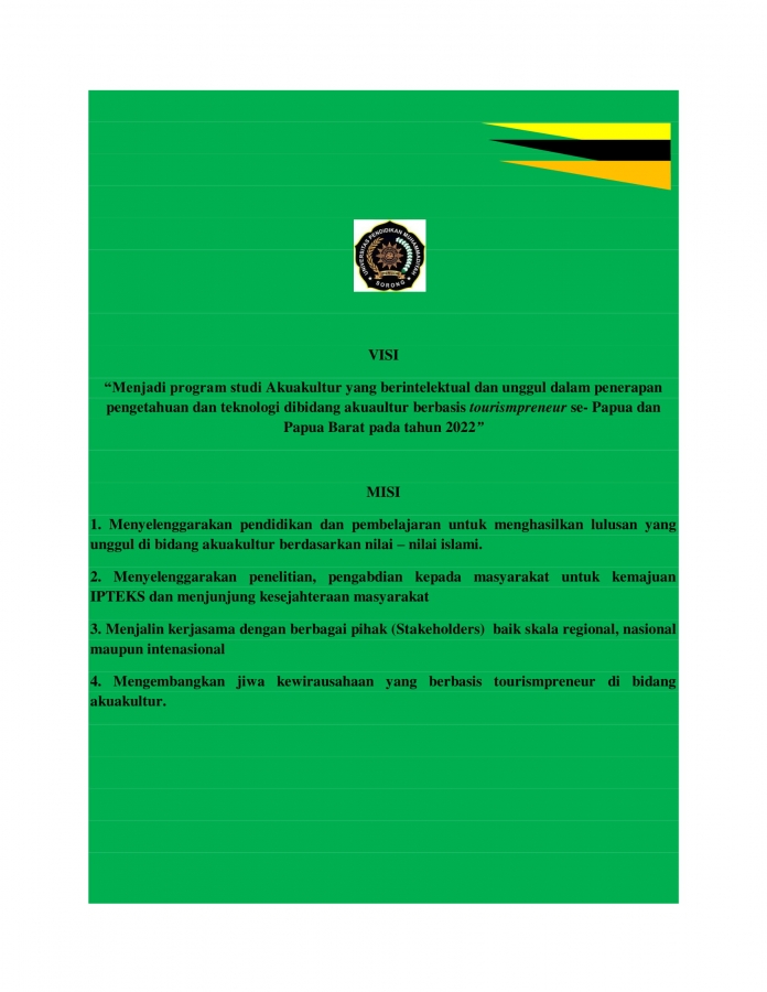 “Menjadi program studi Akuakultur yang berintelektual dan unggul dalam penerapan pengetahuan dan teknologi dibidang akuaultur berbasis tourismpreneur se- Papua dan Papua Barat pada tahun 2022”
